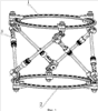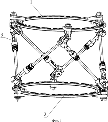 Предлагаемый аппарат (фиг.1) состоит из двух внешних опор (1, 2), которые могут быть как замкнутыми (кольцевая опора), так и незамкнутыми (2/3 кольца, полукольцо), которые соединены между собой системой из шести телескопических штанг (3). При этом крепление данной системы осуществляется в трех точках к каждой опоре, которые не имеют строго определенного положения и могут при необходимости быть перенесены.