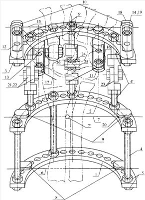 Каждая из трех штанг, скрепляющих дистальное полукольцо 3 со средним 2, образована двумя полуштангами 4 (см. фиг.1), которые скреплены шарниром 21. Полуштанги 4‘ (как и штанги 4) закреплены соответственно на дистальном и среднем полукольцах 3, 2 двумя гайками 5‘, навинченными на полуштанги 4 с противоположных торцов полуколец 3, 2. Шарнир 21 связывает взаимодействующие концы двух полуштанг 4‘ и образован втулками 22, которые навинчены на эти концы резьбовых полуштанг 4. Каждая из втулок 22 выполнена с параллельными сегментными срезами 23 вдоль оси втулок 22. Это позволяет при взаимодействии втулок 22 повысить точность настройки угла между полуштангами, изменяющегося в процессе операции, а также служит для стабильного остеосинтеза. В каждой втулке 22 выполнено перпендикулярное оси сквозное отверстие 24. Осью шарнира, скрепляющего полуштанги, служит болт 25, резьбовой стержень которого пропущен через соосно расположенные отверстия 24. Болт 25 закреплен в отверстии втулок 22 гайкой 26, навинченной на резьбовой стержень этого болта.
