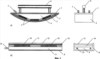 Основание представляет собой корпус 8, выполненный из теплоизоляционного материала. В корпусе 8 расположен прямоугольный жидкостный теплообменник 9, к верхней поверхности которого с обеспечением теплового контакта подведены опорные спаи двух термоэлектрических модулей 10. Рабочие спаи двух термоэлектрических модулей 10 примыкают с обеспечением теплового контакта к металлической пластине 11. Боковые стенки корпуса 8 несколько возвышаются над металлической пластиной 11 (на 2-3 мм) таким образом, что образуют два параллельных бортика 12. Циркуляция жидкости в прямоугольном жидкостном теплообменнике обеспечивается через штуцера 13. Свободное пространство вокруг термоэлектрических модулей 10 заполнено теплоизоляцией 14.