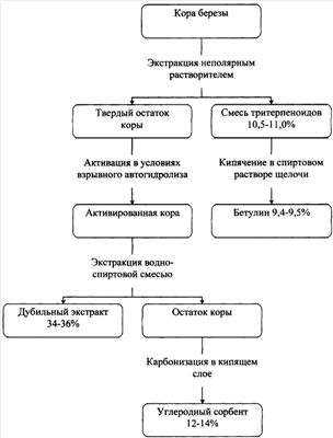 Способ переработки коры березы, включающий измельчение, экстракцию растворителем с последующим выделением смеси тритерпеноидов, отличающийся тем, что переработку коры проводят без предварительного разделения на бересту и луб, экстракцию тритерпеноидов проводят неполярным растворителем и выделенную смесь тритерпеноиодов обрабатывают водной щелочью в течение 1,5-2,0 ч с получением бетулина, затем твердый остаток коры активируют в условиях взрывного автогидролиза, после чего экстрагируют водно-спиртощелочной смесью с получением дубильного экстракта, а остаток коры превращают в углеродные сорбенты карбонизацией в реакторе с кипящем слоем.