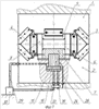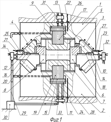 Затем заготовку с помощью манипулятора подают в рабочую зону устройства. После этого включают рабочий ход пресса, при котором его подвижная траверса перемещает в многобойковом ковочном устройстве держатель верхнего бойка 1 вместе с бойком 5 в направлении к заготовке и вместе с бойком 7 обжимает ее в вертикальной плоскости (показано заштрихованное поперечное сечение) (фиг.12). Одновременно с помощью наклонных поверхностей держатель верхнего бойка 1 перемещает в направлении к заготовке держатели 3, 4 боковых бойков 6, 8, которые обжимают ее в радиальном и тангенциальном направлениях (фиг.12). В процессе обжатия заготовки бойками 5-8 в гидроцилиндры 9-12 передаются значительные технологические усилия, создающие большие давления рабочей жидкости в этих гидроцилиндрах (фиг.12). Обратные клапаны, расположенные в блоках управления 31-34 на трубопроводах подвода рабочей жидкости, удерживают объемы рабочей жидкости в гидроцилиндрах 9-12 и за счет этого обеспечивают неизменное положение бойков 5-8.