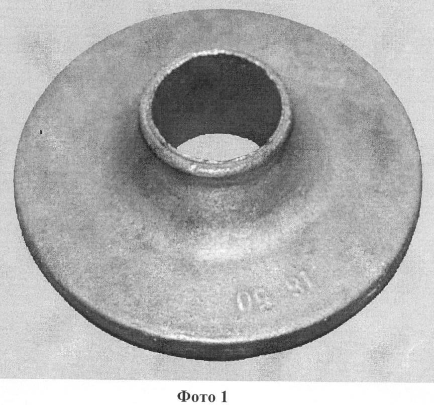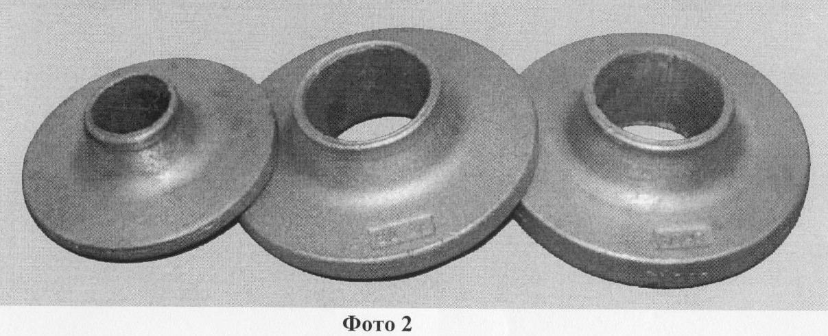 Сущность заявляемого технического решения поясняется схемами и фотографиями, где на фиг.1 изображены стадии формоизменения при получении предварительной поковки, на фиг.2 – стадии формоизменения при получении окончательной поковки, на фото 1 – опытная поковка «фланец воротниковый» Ру16Ду50, на фото 2 – опытная партия поковок «фланец воротниковый».