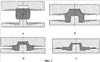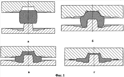 При этом процесс прошивки и калибровки осуществляется следующим образом. Прошивень внедряется в уклон на боковой поверхности основной (верхней) наметки и начинает срезать его (фиг.2а). Одновременно калибрующий поясок входит в полость наметки, раздавая ее и перемещая металл уклона по ходу движения комбинированного прошивня. При этом происходит перераспределение металла с утонением стенки и удлинением воротниковой части. После полного контакта по конусной поверхности матрицы происходит угловой разворот части воротника (фиг.2б), лежащей ниже прошивня до контакта с цилиндрической частью матрицы, и прошивень достигает тела перемычки. Далее прошивень упирается в перемычку (фиг.2в-г), и происходит вытяжка цилиндрического участка стенки воротника и срез перемычки. Одновременно калибрующий поясок, проходящий через полость конического участка матрицы, осуществляет осевой сдвиг металла. В зависимости от геометрических особенностей предварительной поковки на данной стадии возможны варианты формообразования, в которых может превалировать либо эффект вытяжки, сопровождаемый утонением формируемого цилиндрического участка стенки воротника, либо схема выдавливания за счет опережающего перемещения металла калибрующим пояском пуансона.