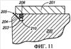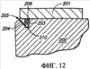 Фиг.11 представляет вид в поперечном разрезе узла альтернативного варианта осуществления системы управления смазкой, которую можно использовать для выполнения на практике этого изобретения, при этом показаны каркас 200 литейной формы, крышка 201 для смазки, трубопровод 203 для смазки с выходным отверстием 205 трубопровода для смазки и канал 204 распространения смазки. Фиг.11 изображает эластичный баллон 210, растянутый внутри трубопровода 203 для смазки и сформированный таким образом, чтобы предотвращать протекание смазки через канал 204 распространения смазки, когда он расширен, но пропускать поток смазки, когда эластичный баллон 210 сжат, как показано на фиг.12.