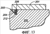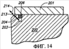 На фиг.13 представлен вид в поперечном разрезе узла альтернативного варианта осуществления системы управления смазкой, который можно использовать при осуществлении на практике изобретения, изображающий пористую мембрану 212 или перегородку, расположенную поперек трубопровода для смазки. Можно выбрать определенный тип конструкции мембраны на основании типа смазки, давления подачи и других параметров. Фиг.13 также изображает каркас 200 литейной формы, крышку 201 для смазки, трубопровод 203 для смазки с выходным отверстием 205 трубопровода для смазки и канал 204 распространения смазки.