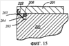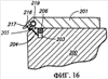 Фиг.14 представляет вид в поперечном разрезе узла альтернативного варианта осуществления системы управления смазкой, который можно использовать при осуществлении на практике изобретения, изображающий отдельный стопорный клапан или проточный стопорный клапан в выходном отверстии для смазки. Запорные клапаны в общем известны, и можно использовать любой из множества различных типов клапанов, причем предпочтительным типом в этом случае является клапан, активизируемый давлением. Клапан 213 или пробку активизируют и перемещают в направлении стрелки 214, когда набрано достаточное давление смазки, чтобы преодолеть смещение клапана 213.