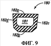 Фиг.9 представляет сечение по линии 9-9 на фиг.8 эластичного баллона 180, в котором изображен корпус 182 эластичного баллона с первой стороной 182a, второй стороной 182b, третьей стороной 182c и четвертой стороной 182d. Специалистам в данной области техники очевидно, что конкретная литейная форма и конфигурация эластичного баллона могут быть выбраны из множества разнообразных форм, в которых необходима остановка потока или смазки. Последующие чертежи в качестве примеров изображают некоторые из других возможных конфигураций. Фиг.9 также изображает внутреннюю полость 181 эластичного баллона 180.