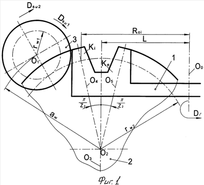 О3 впадины производящего колеса 2 так, что производящие контуры Кi и Ke симметричны относительно оси О3.