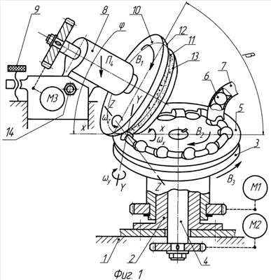 Материал опорной поверхности диска 3 (например, резина) подобран таким образов, что коэффициент трения заготовки по этой поверхности высок. В результате сила трения между заготовкой и опорной поверхностью превышает силу резания и заготовка получает вращение с угловой скоростью х вокруг оси X, проходящей через центр заготовки и вершину конуса на абразивном круге 10. В силу особенностей кинематики, заготовка, перемещаемая сепаратором в клиновом зазоре по дуге профильной канавки 11, наряду с вращением вокруг оси X участвует во вращательном движении вокруг оси Y и оси Z, получая соответственно угловые скорости y и z. Таким образом, заготовка участвует одновременно в трех вращательных движениях х, y z. В результате сложения скоростей вектор мгновенной скорости заготовки, по мере продвижения ее по клиновому зазору, постоянно меняет свое направление, что способствует интенсификации съема припуска, повышает точность сферической формы шара и качество его поверхности за счет перекрестного характера рисок.