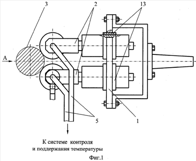 На роликах закреплены съемные упрочняюще-деформирующие элементы 4 (фиг.2), оборудованные токоподводом для соединения с источником тока (на фиг.2 не показан) и системой контроля и поддержания температуры рабочей поверхности (на фиг.2 не показана), с которой ролики соединены патрубками 5. В состав токоподвода включены соединительные кабели 6, два токосъемных устройства 7, оси 8 и втулки 9 роликов. Токосъемные устройства 7 состоят из неподвижных контактов 10, подключенных к источнику тока и имеющих внутренний объем, который заполнен жидкой средой 11, обладающей высокой электрической проводимостью (например, ртутью), и подвижных контактов 12, которые помещены в жидкую среду 11 и соединены осью 8 и втулкой 9 с упрочняюще-деформирующими элементами 4 роликов. При этом материалы неподвижных 10 и подвижных 12 контактов обладают свойством смачиваемости с веществом жидкой среды 11. Таким образом, токоподвод содержит выполненные из химически и электрически однородных материалов токосъемные устройства с неподвижными контактами и связанными с последними через жидкую среду, обладающую высокой электрической проводимостью, подвижными контактами и элементы механической и электрической связи, посредством которых упрочняюще-деформирующие элементы роликов соединены с подвижными контактами. Кроме того, ролики 2 (фиг.1) имеют электрическую изоляцию 13 от державки 1.