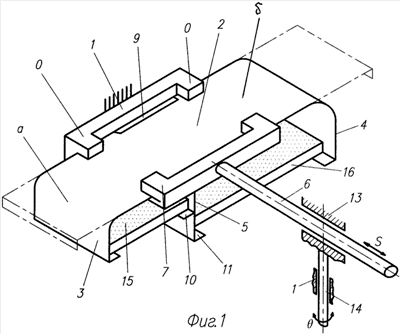 Для переналадки на другие размеры деталей стенка 5 передвигается вдоль центральной части. При необходимости захвата одной детали толкатель 6 поворачивается вместе с направляющей 13 вокруг оси 14 на угол , обеспечивающий контакт одного конца вилки 7 с заданным рабочим участком в одной из опор 0. Наибольшая длина захватываемой детали соответствует расстоянию между плечами. С этой целью стенка сдвигается вплотную к одному из плеч, и положение ее полок соответствует высоте детали.