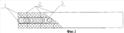 При воздействии на пожаростойкое покрытие значительной тепловой нагрузки, превышающей расчетную, теплозащитный слой 1, контактирующий с огнем, постепенно прогревается и передает тепло волокнам 3 из материала с эффектом памяти формы, выполненного в виде тонких нитей (проволок) на основе эквиатомного титано-никелевого сплава. Волокна 3 нагреваются до достижения критической температуры начала фазового превращения в материале. Материал волокон 3 претерпевает фазовое превращение и изменяет свою форму, т.е. разворачивается и приобретает заданную хаотично скрученную объемную форму. При этом расстояние между изолирующими слоями 1 увеличивается до расстояния, которое ограничивается изменением формы проволок. Нити волокон раскручиваются и стремятся приобрести объемную форму. При этом значительная первоначальная деформация и силы трения отдельных проволок позволяют полностью восстановить форму до 60 80 процентов [5].