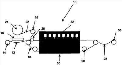 Позицией 10 обозначена дублировочная установка. Слой основы 12 разматывается из рулона хранения 14 и подается под инфракрасную лампу 16, где слой основы нагревается до температуры около 120°С для того, чтобы размягчить его верхнюю поверхность. Предварительно нагретый слой основы затем укладывается на ленту транспортера 18, вместе с которой он может транспортироваться сквозь печь. Лента транспортера 18 натягивается посредством ряда роликов 20, которые обеспечивают ее перемещение и удерживают ее под определенным натяжением.