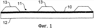 Как вариант однослойной подложки 12 может быть использована многослойная подложка 12, 14, как показано на Фиг.2, в которой второй слой 14 выполнен отдельно и соединен с первым слоем 12 способом, похожим на описанный в ЕР-А-860298. При таком способе защитный элемент 10 частично встроен в первый слой 12. Как вариант, он может быть помещен между двумя мокрыми слоями до ламинирования, как описано в ЕР-А-229645, как показано на Фиг.3.