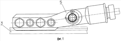 Второй этап монтирования предлагаемого зажима заключается в установке плашечной части на контактный провод 3. Для этого плашки 1 и 2 подводятся к контактному проводу 3 с обеих сторон, при этом фаска последнего размещается в их желобах, и скрепляются посредством болтов 4. После этого плашечную и цанговую части зажима соединяют друг с другом шарнирно, размещая проушину 11 корпуса 6 между проушинами 5 плашек 1 и 2 и соединяя их между собой посредством оси 12.
