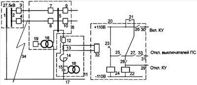 1, 2 – шины 27,5 кВ тяговой подстанции;