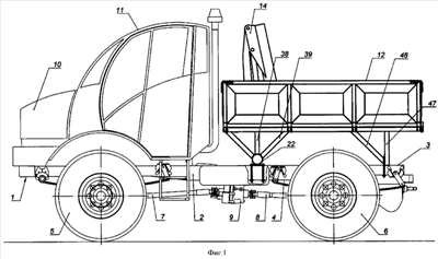 Представленная на фиг.1 грузовая колесная машина содержит раму 1, состоящую из лонжеронов 2, имеющих профиль швеллера с горизонтально расположенными верхними полками 3 и нижними полками 4. К раме 1 подвешены на рессорах передние управляемые ведущие колеса 5 и задние ведущие колеса 6. Передние и задние колеса 5, 6 имеют привод карданными передачами 7, 8 от раздаточной коробки 9, закрепленной на раме 1. Раздаточная коробка 9 имеет кинематическую связь с размещенным под капотом 10 силовым агрегатом, состоящим из двигателя внутреннего сгорания и коробки передач.