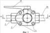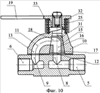 фиг.10 – разобщительный кран с запорным узлом с коническим запорным элементом (в открытом положении), ось поворота рукоятки перпендикулярна плоскости соединения узлов (вариант 3);