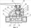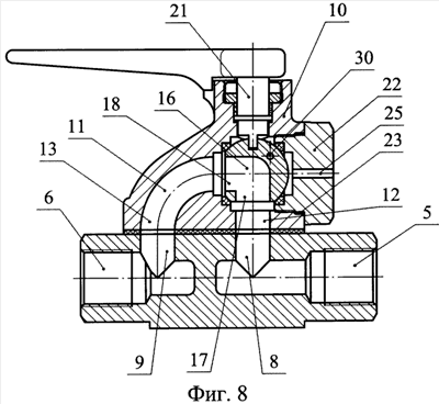 фиг.8 – разобщительный кран с запорным узлом с шаровым запорным элементом (в открытом положении), ось поворота рукоятки перпендикулярна плоскости соединения узлов (вариант 2);