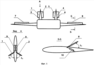 Предлагаемый способ осуществляется в устройстве для управления устойчивостью летательного аппарата в полете, содержащем отклоняемые управляющие поверхности в виде флаперонов или элеронов и цельноповоротных килей и дополнительные управляющие поверхности, расположенные на внутренних сторонах левого и правого килей, а также расположенные на верхних поверхностях левой и правой консолях крыла летательного аппарата.