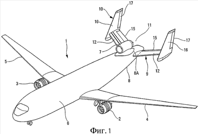 На фиг.1, 4 и 5 показано более определенно, что горизонтальная 9 и вертикальная 10 хвостовые части согласно изобретению образуют канал 11, который в этом примере выполнен приблизительно U-образным и который геометрически симметричен по отношению к продольной плоскости Р фюзеляжа 6. Третий двигатель 7 расположен в плоскости симметрии канала, то есть в плоскости Р, и предпочтительно установлен в верхней части 8А задней части 8 фюзеляжа перед горизонтальной 9 и вертикальной 10 хвостовыми частями, так что его выходное отверстие 7А находится у входа канала 11, как показано, в частности, на фиг.2 и 3.