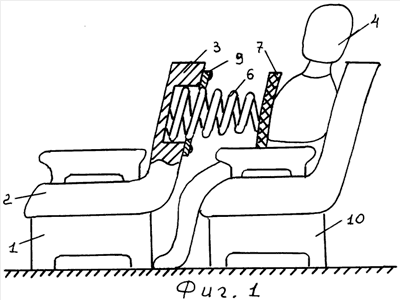 В исходном состоянии пассажир 4 сидит в кресле 10 /см. фиг.2 и фиг.3/, коническая пружина 6 с усилием сжата и введена в глухое отверстие 5 в спинке 3 кресла 1, при этом верхний торец пружины 6 с закрепленной на ней пластиной 7 несколько выступает наружу из выхода отверстия 5, что дает возможность ввести с боков в этот выступ пружины 6 между ее витками концы планок 9, удерживающие пружину 6 в исходно сжатом состоянии, препятствуя ее выходу наружу из отверстия 5. Планки 9 вводят между витками пружины 6 при незажатых винтах 8, после чего последние жестко зажимаются и контрятся. При этом витки пружины 6 в сжатом состоянии частично концентрично входят друг в друга, что позволяет уместить пружину 6 в глухом отверстии 5, занимающем по глубине часть толщины спинки 3. В случае нехватки для этого толщины спинки 3 на задней поверхности последней может быть выполнен специальный выступ для размещения пружины 6. С помощью расположенной в салоне видеокамеры общего обзора пилоты, находясь в кабине, обнаруживают пассажира, предположительно представляющего опасность с точки зрения террористического захвата самолета, и принимают меры к его изоляции. Для этого на специальном пульте управления в кабине пилотов нажимается кнопка с номером, соответствующим номеру кресла 10, установленного позади кресла 1 с данным устройством, то есть при нажатии кнопки с номером кресла 10 с подозрительным пассажиром 4 срабатывает устройство на впереди расположенном кресле 1. При этом планки 9 запитываются от источника постоянного тока определенной амплитуды. При протекании по планкам такого тока в течение, например, 3-5 с планки 9 разогреваются до пороговой температуры 120°С. При этом концы планок 9 скачком изгибаются на фиксированные углы /правая планка на фиг.3 – вправо, левая – влево/ относительно мест их консольного крепления винтами 8. В результате такого изгиба концов планок 9 указанные концы выходят из тела пружины 6, витки в верхней части конической пружины 6, имеющие меньший диаметр, высвобождаются, при этом данная часть пружины 6 вместе с пластиной 7 “выстреливает” из отверстия 5, и пластина 5 ударяет пассажира 4 в грудь, прижимая его к спинке сиденья 10 /фиг.1/, естественно, что длина этой верхней части пружины 6, ее диаметры, угол изгиба планок 9 и т.д. подбираются таким образом, чтобы пластина 7 прижала пассажира 4 к спинке, причем с запасом длины. В результате пассажир 4 оказывается зажатым между пластиной 7 и спинкой кресла 10 и его подлокотниками /боковинами/ 12. Естественно, что неожиданный динамический удар, сопровождающийся прижатием, позволит временно нейтрализовать пассажира, и, скорее всего, данный эффект будет достаточным. Однако в случае предпринятия пассажиром 4 дальнейших активных действий по своему освобождению, попытках вытащить посторонние предметы и т.п. вышеуказанная кнопка на пульте управления нажимается повторно, в результате на планки 9 подается ток с более высокой амплитудой, происходит дальнейший разогрев планок до 160°С и их новый изгибный скачок в ту же сторону. В результате освобождаются почти все витки пружины 6 большего диаметра, усилие прижатия пассажира к спинке скачком увеличивается. Очевидно, что производя несколько раз данное действие можно добиться полной физической нейтрализации представляющего опасность пассажира, полностью лишая его возможно