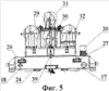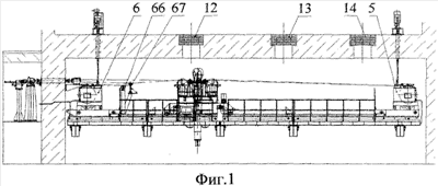 Данная схема обеспечивает вертикальность подъема груза и равномерность нагрузок на барабаны механизма подъема. Для компенсации вытяжки канатов в процессе перемещения груза коромысла могут поворачиваться на осях рамы на угол ±5°. За счет поворота коромысел регулируется разность вытяжки грузовых канатов в процессе работы тележки. Блоки 30 и 31 на грузовой тележке установлены один над другим. При этом блоки установлены под углом так, что линия пересечения плоскостей, проходящих через центры канавок блоков, совпадает с вертикальной осью захвата, и в случае обрыва одного грузового каната не происходит смещение центра масс груза, что обеспечивает высокую безопасность механизма перемещения груза. Схема запасовки грузовых канатов приведена ни фиг.20.