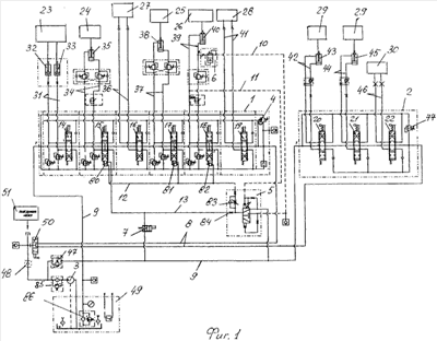 Многосекционный гидропривод краноманипуляторной установки содержит два гидроблока 1, 2, насосную станцию 3, защитно-предохранительную аппаратуру – предохранительный клапан 4, перекидной клапан 5, клапан 6 обрыва линии, клапан 7 разблокировки, систему управления с управляющими органами рычажного типа (не показана), гидравлические соединительные магистрали: напорную 8, сливную 9, две управляющие 10, 11, исполнительную напорную 12, исполнительную сливную 13 (в примере исполнения магистрали могут быть двух типов: трубопроводы и рукава высокого давления). Гидроблок 1 содержит шесть гидрораспределителей 14, 15, 16, 17, 18, 19, гидроблок 2 содержит три гидрораспределителя 20, 21, 22 – и тот, и другой по количеству секций гидропривода. Первый шестисекционный гидроблок 1 управления колонной 23, стрелами 24, 25, 26, грузозахватными органами 27, 28 сообщен магистралью 8 напорной с насосной станцией 3 и магистралью 9 сливной. Второй трехсекционный гидроблок 2 управления двумя опорами 29 и механизмом 30 опрокидывания кузова самосвального автомобиля (не показан) сообщен магистралью 8 напорной с насосной станцией 3 и магистралью 9 сливной. Две линии 31 первой секции первого гидроблока 1 подключены к двум гидроцилиндрам 32, 33 поворотной колонны 23. Две линии 34 второй его секции – к гидроцилиндру 35 стрелы 24 выносной. Две линии 36 третьей секции – к грузозахватному органу 27. Две линии 37 четвертой секции – к гидроцилиндру 38 стрелы 25 телескопической. Две линии 39 пятой секции – к гидроцилиндру 40 стрелы 26 подъемной. Две линии 41 шестой секции – к грузозахватному органу 28. Две линии 42 первой секции второго гидроблока 2 подключены к гидроцилиндру 43 первой опоры 29. Две линии 44 второй секции – к гидроцилиндру 45 второй опоры 29. Две линии 46 третьей секции – к механизму 30 опрокидывания кузова.