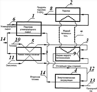 Предлагаемый способ реализуется по схеме, изображенной на чертеже. Схема состоит из подогревателя углеводородного сырья 1, реакционной камеры пиролиза углеводородного сырья 2, камеры нагрева жидкого теплоносителя 3, камеры энергохимической аккумуляции (ЭХА) отходящих газов 4, подогревателя топлива и окислителя 5. В качестве рабочих сред на схеме показаны: углеводородное сырье 6, жидкий теплоноситель 7, продукты пиролиза 8, продукты сгорания 9, газовое топливо 10, окислитель 11, отходящие газы 12, природный газ для энергохимической аккумуляции 13, вторичное топливо 14.