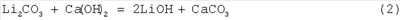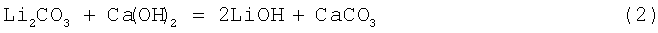 Изобретение относится к химической технологии, в частности к получению моногидрата гидроксида лития из карбоната лития. Известен способ получения моногидрата гидроксида лития (LiOH·Н2О) действием гидроксида бария на раствор сульфата лития [Остроушко Ю.И., Бучихин П.И., Алексеева В.В. и др. Литий, его химия и технология. – М.: Атомиздат, 1960. – С.159], принятый за аналог. Взаимодействие сульфата лития с гидроксидом бария протекает в соответствии с уравнением реакции: Недостатками способа-аналога являются большой расход дорогостоящего реагента – гидроксида бария, и трудности отмывки гидроксида лития от объемистого осадка сульфата бария. Наиболее близким по технической сущности и достигаемому результату к заявляемому способу является способ получения моногидрата гидроксида лития, основанный на каустификации карбоната лития известью [Остроушко Ю.И., Бучихин П.И., Алексеева В.В. и др. Литий, его химия и технология. – М.: Атомиздат, 1960. – С.159-163], принятый за прототип. Взаимодействие карбоната лития с гидроксидом кальция протекает в соответствии с уравнением реакции: Согласно способу-прототипу Li2CO3 и известковое молоко тщательно перемешивают и нагревают до кипения. Полученный в результате каустификации раствор гидроксида лития отделяют от нерастворимого карбоната кальция противоточной декантацией. Декантированный раствор гидроксида лития загрязнен гидроксидом кальция, т.к. указанное соединение имеет заметную растворимость в воде. Затем декантированный раствор упаривают, повышая содержание гидроксида лития в растворе с ~32 г/л до ~167 г/л. Далее из упаренного раствора кристаллизуют черновой моногидрат гидроксида лития, который загрязнен гидроксидом кальция. Для кристаллизации чернового моногидрата гидроксида лития упаренный раствор гидроксида лития охлаждают со 100°С до температуры 40°С, при которой растворимость моногидрата гидроксида лития снижается до ~129 г/л по LiOH [Остроушко Ю.И., Бучихин П.И., Алексеева В.В. и др. Литий, его химия и технология. – М.: Атомиздат, 1960. – С.46]. Кристаллизовавшийся из упаренного раствора черновой моногидрат гидроксида лития отделяют центрифугированием от маточного раствора. Недостатками способа-прототипа является загрязненность получаемого с его использованием моногидрата гидроксида лития кальцием, что требует проведения многостадийной и дорогостоящей очистки больших объемов моногидрата гидроксида лития методом его перекристаллизации. Перекристаллизация включает растворение моногидрата гидроксида лития в воде и/или маточном растворе от предыдущей перекристаллизации моногидрата гидроксида лития при 100°С до получения раствора гидроксида лития концентрацией ~167 г/л. Для обесцвечивания в раствор добавляют небольшое количество газовой сажи, отделяемую затем вместе с гидроксидом кальция от раствора гидроксида лития. Очищенный от кальция раствор гидроксида лития охлаждают, после чего кристаллизовавшийся из него технический моногидрат гидроксида лития отделяют от маточного раствора. Задачей, на решение которой направлено заявляемое изобретение, является разработка способа получения моногидрата гидроксида лития, обеспечивающего снижение объема чернового моногидрата гидроксида лития, требующего перекристаллизации, и сокращение на этой основе затрат на перекристаллизацию. Сущность заяв