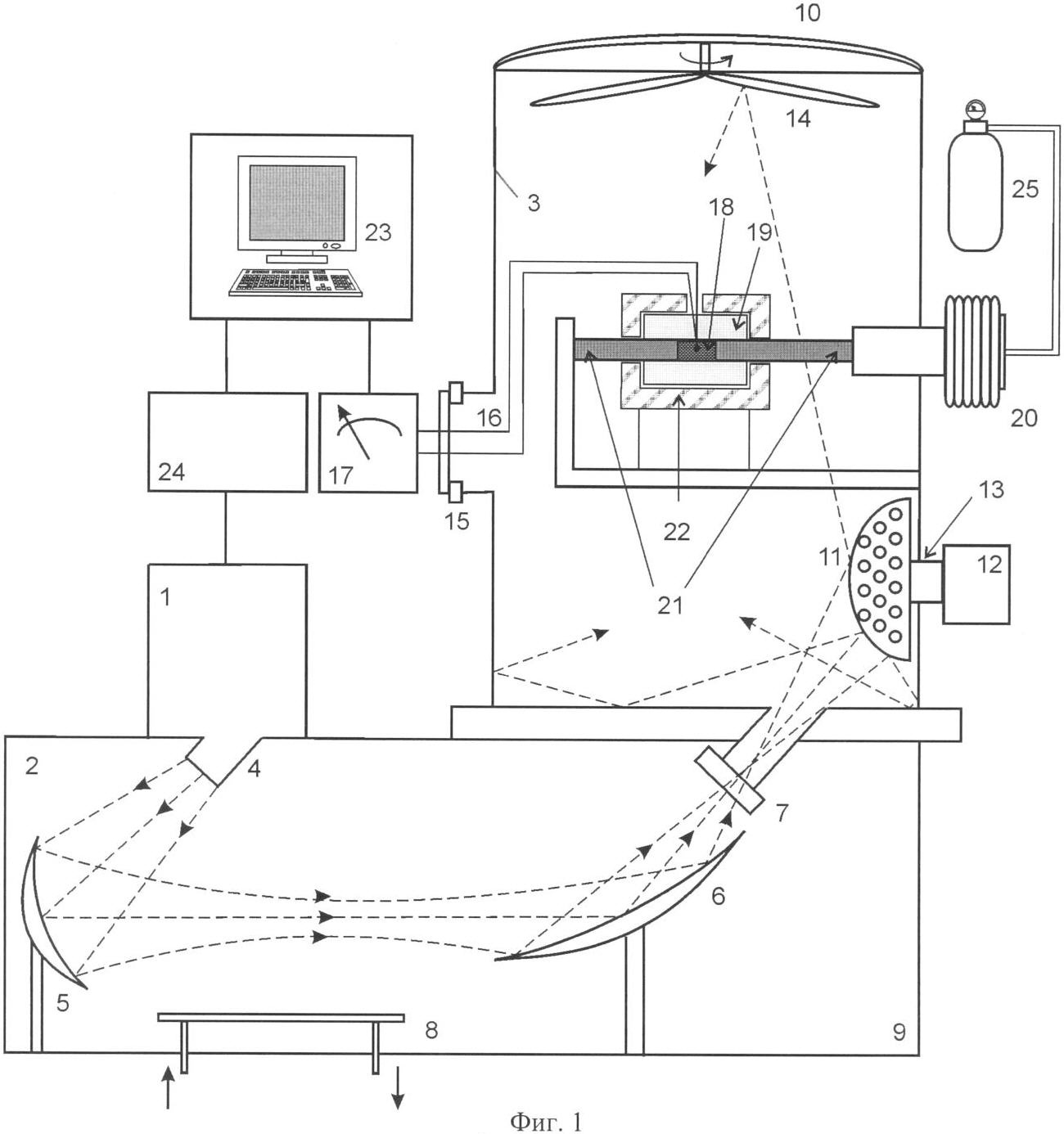Температура на поверхности спекаемого изделия 18 измеряется высокотемпературной термопарой 16. Головка термопары находится в контакте с поверхностью изделия, а ее свободные концы соединяются через электрически изолированные выводы с измерительным устройством 17. Данные с измерительного устройства 17 подаются на компьютер 23. Также на компьютер подается информация о величине усадки спекаемого изделия 18 с датчика перемещения 26. Компьютер 23 управляет работой источника питания 24, который питает микроволновый источник 1. Таким образом, цепь обратной связи охватывает компоненты разработанного устройства для спекания керамического изделия 18.