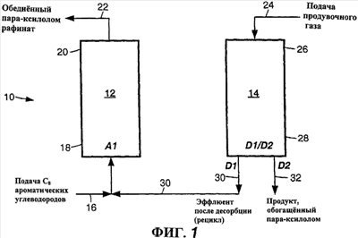 Предполагается, что термин “рафинат” по данному описанию относится к части текучей среды (жидкости или газа), которая остается после удаления, например, с помощью адсорбции, других нужных компонентов. Обедненный пара-ксилолом рафинат, как правило, включает одну или более составляющих смеси (сырье, исходная смесь), контактирующей с адсорбентом, но имеет более низкую концентрацию пара-ксилола, чем исходная смесь. Термин “обедненный пара-ксилолом” в выражении “обедненный пара-ксилолом рафинат” означает просто, что концентрация пара-ксилола ниже, предпочтительно, значительно ниже, чем концентрация пара-ксилола в смеси, контактирующей с адсорбентом. Термин не означает, что рафинат не содержит пара-ксилола. Таким образом, обедненный пара-ксилолом рафинат, по-видимому, будет содержать более низкую концентрацию пара-ксилола, более высокие концентрации других изомеров ксилола, этилбензол и отличные от C8 ароматические углеводороды, которые могут присутствовать в исходной (поступающей в адсорбер) смеси.