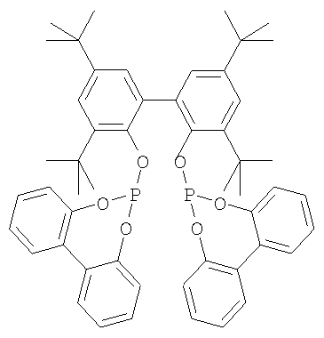 Пример 5 Этот пример демонстрирует применение смешанного дифосфит-фосфинового комплекса НКП(СО)А(Ph3Р)2 в катализе гидроформилировании 1-октена. В 50 мл стальной автоклав помещают 20 мл (0.127 моль) 1-октена, автоклав продувают азотом (3×15 атм), нагревают до 90°С и устанавливают избыточное давление 1 атм. После этого с помощью дозирующего устройства вводят раствор 44,8 мг (0,03 ммоль) гидридного комплекса HRh(CO)A(Ph3P)2 в 4 мл сухого толуола и быстро доводят общее давление синтез-газом до 20-21 атм. Далее давление поддерживают постоянным и определяют скорость реакции по начальному участку кинетической кривой поглощения синтез-газа. После 60 мин нагревания автоклав охлаждают и определяют выход продуктов с помощью ГЖХ. Пример 6 В 50 мл стальной автоклав помещают 20 мл (0.127 моль) октена-1, и 7,74 мг (0,03 ммоль) 3.0*10-5 моль дикарбонилацетиацетоната родия Rh(acac)(CO)2. Автоклав продувают азотом (3×15 атм), нагревают до 90°С и устанавливают избыточное давление 1 атм. После чего с помощью дозирующего устройства вводят раствор 25,2 мг (0,03 ммоль) лиганда (А) и 15,8 мг (0,06 ммоль) трифенилфосфина в 4 мл сухого толуола, затем быстро доводят общее давление синтез-газом до 20-21 атм. Далее давление поддерживают постоянным и определяют скорость реакции по начальному участку кинетической кривой поглощения синтез-газа. После 60 мин нагревания автоклав охлаждают и определяют выход продуктов с помощью ГЖХ. Пример 6 показывает, что при формировании каталитического комплекса HRh(СО)А(Ph3Р)2 in situ в условиях гидроформилирования 1-октена достигаются практически такие же показатели процесса, как при использовании готового катализатора (пример 5). Сравнительный пример С4. Гидроформилирование 1-октена проводится аналогично примеру 6, за исключением того, что трифенилфосфин не добавляется. Сравнительный пример С4 показывает, что когда каталитический комплекс HRh(СО)А(Ph3Р)2 не может формироваться (один из лигандов отсутствует) показатели процесса много хуже, чем когда используется готовый катализатор HRh(СО)А(Ph3Р)2 (пример 5) или когда этот катализатор формируется in situ (пример 6). В таблице 2 приведены примеры 5, 6 и сравнительный пример С4.