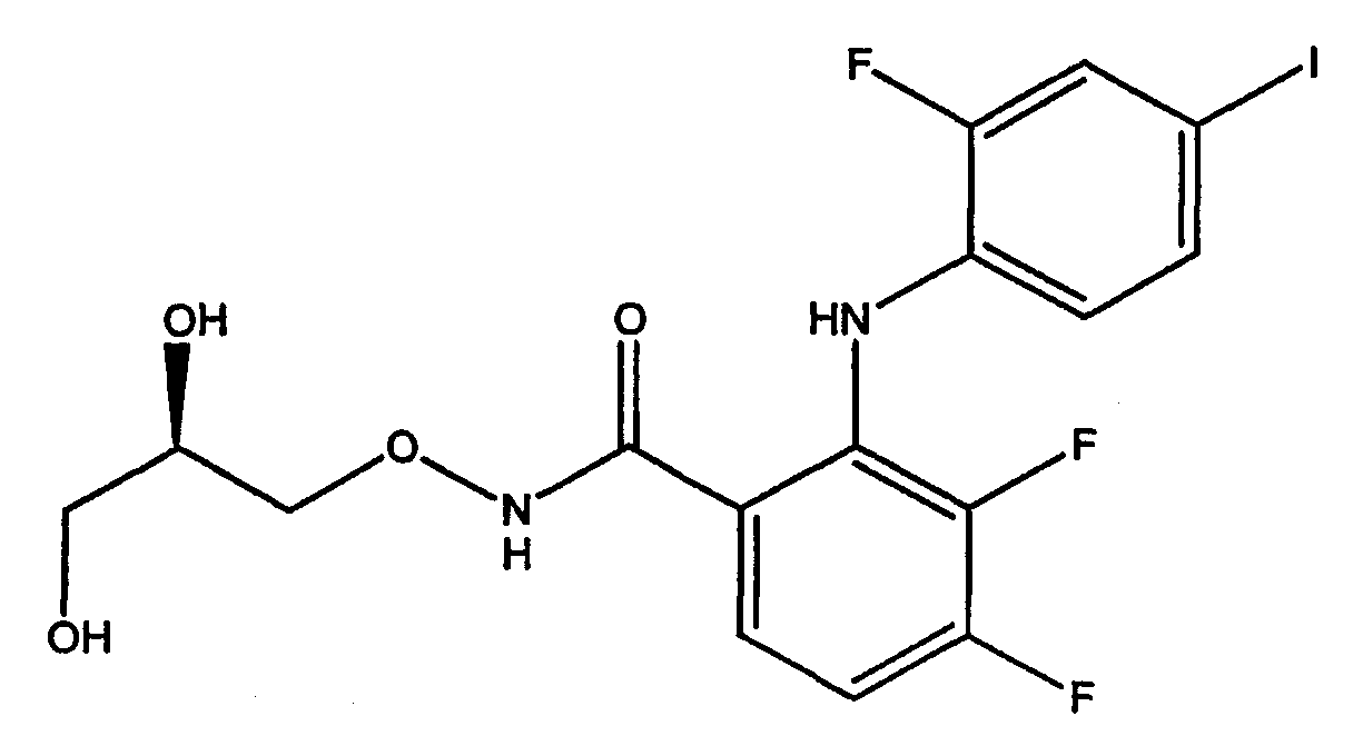 Подразумевается, что N-[(R)-2,3-дигидроксипропокси]-3,4-дифтор-2-(2-фтор-4-йодфениламино)бензамид может быть легко получен известными в технике способами. Например, он может быть получен, как описано в способах патентной заявки WO 2002006213 A2 (Barrett et al.), исходя из реакции 2-фтор-4-йодфениламина (регистрационный 367-25-9) с 2,3,4-трифторбензойной кислотой (регистрационный номер 61079-72-9) в присутствии органического основания, такого как диизопропиламид лития, с образованием 3,4-дифтор-2-(2-фтор-4-йодфениламино)бензойной кислоты, которая может затем взаимодействовать с (R)-O-(2,2-диметил-[1,3]диоксалан-4-илметил)гидроксиламином. Образующийся продукт может быть гидролизован с помощью водного раствора кислоты с образованием N-[(R)-2,3-дигидроксипропокси]-3,4-дифтор-2-(2-фтор-4-йодфениламино)бензамида.