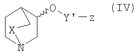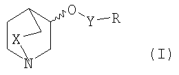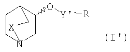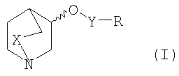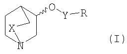 Пример 1: Получение (рац.)-3-[6-(4-фторфенил)-пиридазин-3-илокси]-1-азабицикло [2,2,2]октана Раствор (рац.)-3-хинуклидинола (0,007 моль) в сухом ТГФ под азотом обрабатывали гидридом натрия (60% в минеральном масле; 1,1 эквив.). Через 1 час при комнатной температуре добавляли раствор 3-хлор-6-(4-фтор-фенил)пиридазина (1,0 эквив.) в ТГФ (30 мл) и реакционную смесь нагревали при кипении с обратным холодильником в течение 6 часов. После охлаждения до комнатной температуры ТГФ упаривали и остаток растворяли в этилацетате (100 мл) и затем промывали водой (3×20 мл), затем раствором хлорида натрия (20 мл). Этилацетат сушили над безводным сульфатом магния, отфильтровывали и упаривали досуха и полученное масло очищали колоночной хроматографией на силикагеле (элюент: этилацетат-метанол-триэтиламин (50:10:2) с получением (рац.)-3-[6-(4-фторфенил)-пиридазин-3-илокси]-1-азабицикло[2,2,2]октана в виде бесцветного твердого вещества. 1Н-ЯМР (400 МГц, CDCl3): Следующие соединения формулы I, в которых Y представляет собой