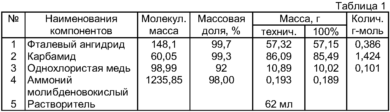 Целью изобретения явилась разработка универсального, высокопроизводительного и экономичного способа получения фталоцианинов металлов высокого качества с высоким выходом. Сущность предлагаемого изобретения заключается в том, что взаимодействие фталевого ангидрида, карбамида и соли соответствующего металла осуществляют в присутствии катализатора в среде растворителя, представляющего собой техническую смесь диизопропилбензолов с температурой кипения 190-220°С. Применение указанного растворителя позволяет проводить процесс при достаточно низкой температуре при кипении растворителя, удалять растворитель под вакуумом после окончания синтеза, выделять продукт в твердом виде, упростить аппаратурное оформление процесса, исключив стадии фильтрации, обработки низкокипящим растворителем с последующей фильтрацией и сушкой от органического растворителя (таблица). Изобретение относится к химической промышленности, в частности к технологии получения фталоцианинов металлов, которые являются полупродуктами в синтезе фталоцианиновых красителей и пигментов, а также используются в качестве катализаторов в процессах очистки нефти и газов, компонентов электрофотографических устройств. Фталоцианины металлов (РсМе) преимущественно получают взаимодействием фталевой кислоты или ее солей, или ангидрида, или имида, или нитрила фталевой кислоты (а также их моногалогенпроизводных) с источником азота, например карбамидом, металлами или их солями в присутствии катализатора (соединениями молибдена, вольфрама, титана, бора и др.). Способы получения РсМе условно, по технологическому оформлению, делятся на две группы: взаимодействие исходных компонентов в высококипящих органических растворителях или при их “запекании” при высоких температурах без использования растворителя. Так, известны способы получения РсМе в нитробензоле, керосине, трихлорбензоле (W.Herbst, K.Hunger “Industrielle Organische Pigmente: Herstellung, Eigenschaften, Anwendung”, 2., vollst. überarb. Aufl., s.439-441, Weinheim; New York; Basel; Cambridge; Tokyo: VCH, 1995). Эти способы обеспечивают возможность получения конечных продуктов высокого качества, однако концентрация реагирующих веществ в реакционных массах низка и, соответственно, низка производительность оборудования. Кроме того, существует проблема отделения растворителя от целевого продукта, что технологически обеспечивается либо отгонкой растворителя с водяным паром, приводящей к образованию загрязненных сточных вод и дополнительным энергетическим затратам, либо обработкой низкокипящим растворителем с последующей фильтрацией и сушкой от органического растворителя. Принципиальными недостатками этих способов являются низкие выходы при синтезе фталоцианинов кобальта и никеля и невозможность получения фталоцианина железа. Кроме того, наиболее часто применяемые растворители (трихлорбензол и нитробензол) имеют высокую токсичность. Способы “запекания ” производительны (Пат. ФРГ DE 2657139 А1, кл. C07D 487/22, оп. 22.06.78 г.; Пат. ГДР Известен также способ получения РсМе нагреванием смеси реагентов посредством микроволнового излучения до температуры 180-300°С в течение 5-10 минут с последующим охлаждением и очисткой плава (Пат. RU Недостатками данного способа являются высокая энергоемкость и необходимость использования труднодоступного нетрадиционного оборудования. Наиболее близки