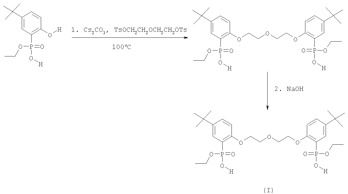 Соединение формулы (I) 1,5-Бис[2-(оксиэтоксифосфинил)-4-(третбутил)-фенокси]-3-оксапентан синтезируют в две стадии исходя из 2-диэтоксифосфинил-4-третбутилфенола. Взаимодействие которого с дитозилатом диэтиленгликоля в присутствии безводного карбоната цезия в кипящем диоксане дает промежуточное соединение -1,5-Бис[2-(диэтоксифосфинил)-4-третбутил-фенокси]-3-оксапентан. Последующий щелочной гидролиз, которого приводит к целевому соединению (I) (схема 1):