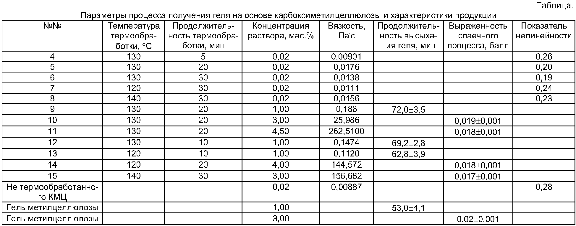 Способ получения геля на основе карбоксиметилцеллюлозы, включающий термообработку исходной карбоксиметилцеллюлозы в натриевой форме при 120-140°С в течение 5-30 мин и последующее растворение ее в воде при 18-25°С с образованием 0,02-4,5%-ного гелиевого раствора.