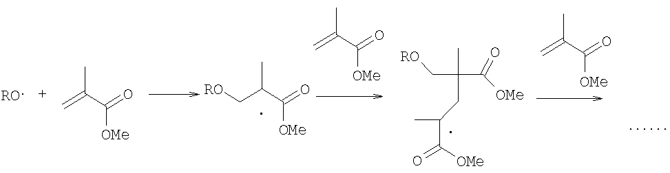 Процесс ведут при температуре 60-96°С в отсутствии растворителя; время реакции 5-8 часов. Применение геминальных бисгидропероксидов как инициаторов полимеризации метилметакрилата позволяет упростить процесс за счет использования технологически доступных инициаторов, которые получают из промышленно производимого сырья, такого как кетоны и водные растворы пероксида водорода; сократить время реакции (5-8 часов) и использовать инициаторы в достаточно малых количествах (0.05-0.5%) ввиду их активности. Кроме того, процесс не требует использования растворителя и высоких температур, при этом сохраняется достаточно высокий выход полиметилметакрилата 57-93%. Отличительной особенностью способа является то, что эти пероксиды не использовались для получения полиметилметакрилата. Высокий выход полиметилметакрилата оказался неожиданным, поскольку ранее на основании общепринятых представлений об инициировании пероксидами (соединениями с фрагментом О-О) радикальной полимеризации авторами была предпринята попытка полимеризации указанными геминальными бисгидропероксидами родственного по структуре (содержащего электроноакцепторный заместитель при двойной связи) акрилонитрила, в результате, в аналогичных условиях, выход полиакрилонитрила составил 31% (см. сравнительный пример). При распаде геминальных бисгидпропероксидов образуется ряд активных радикальных частиц, которые инициируют полимеризацию. Механизм зарождения и развития цепи с использованием 1,1-бисгидропероксициклогексана выглядит следующим образом: Вследствие того, что при распаде геминальных бисгидропероксидов образуются радикальные частицы иного строения, чем при распаде других типов пероксидов, используемых для полимеризации непредельных соединений, полимеризация этих непредельных соединений с применением геминальных бисгидропероксидов может не протекать. Факт образования из геминальных бисгидропероксидов радикальных частиц иного строения делает неочевидным получение полимеров с их использованием. Ранее геминальные бисгидропероксиды, за исключением низших гомологов, например производных ацетона и метилэтилкетона, которые по склонности к радикальному распаду значительно отличаются от более высокомолекулярных структур, были труднодоступны или недоступны; их использование в качестве инициаторов полимеризации представлялось экономически нецелесообразным и не исследовалось. Недавно авторами предложены удобные низкозатратные и технологичные методы получения геминальных бисгидропероксидов: – А.О.Terent’ev, A.V.Kutkin, М.М.Platonov, Y.N.Ogibin, G.I.Nikishin. A new method for synthesis of bishydroperoxides based on a reaction of ketals with hydrogen peroxide catalyzed by boron trifluoride complexes. Tetrahedron Letters, 2003, 44, 7359-7363; – A.O.Terent’ev, M.M.Platonov, Yu.N.Ogibin, G.I.Nikishin. Convenient synthesis of geminal bishydroperoxides by the reaction of ketones with hydrogen peroxide. Synthetic Communications, 2007,37(8), 1281-1287; – A.O.Терентьев, M.M.Платонов, Г.И.Никишин, M.M.Корольков, A.B.Куткин, А.Ю.Уткин. Способ получения геминальных дигидропероксидов. Заявка на получение патента РФ, Эти методы в сочетании с исследованиями по использованию средне- и высокомолекулярных геминальных бисгидропероксидов для инициирования полимеризации могут стать основой для создания нового класса промышленно производимых пероксидных инициаторов. Изобретение иллюстрируется следующими примерами. Пример 1. В ампулу объемом 5 мл загружают метилмета