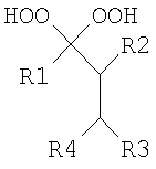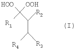 Настоящее изобретение относится к области химии высокомолекулярных соединений, конкретно к способу получения полиметилметакрилата с использованием геминальных бисгидропероксидов. Полиметилметакрилат, получаемый радиальной полимеризацией в массе, – бесцветный прозрачный полимер с высокой проницаемостью для видимого и УФ-света, хорошими электроизоляционными свойствами и высокой стойкостью к действию атмосферных факторов. Полиметилметакрилат нашел широкое применение в автомобильной промышленности, приборостроении и для изготовления товаров народного потребления. Известен способ получения полиметилметакрилата полимеризацией метилметакрилата под действием диалкилпероксидов в качестве инициаторов радикальной полимеризации в присутствии растворителя и при температуре процесса 90-200°С. Способ отличается от предлагаемого использованием растворителя, достаточно высокой температурой проведения процесса, а также использованием других по строению пероксидов [US 2003/0225229 от 4.12.2003]. Известен также и принят нами за прототип способ получения полиметилметакрилата путем полимеризации метилметакрилата под действием стиролсодержащего пероксида в качестве инициатора радикальной полимеризации в количестве 10% весовых от метилметакрилата. Процесс ведут при температуре 50-100°С в инертной атмосфере в закрытой емкости в течение 16 часов [патент GB 1262890 по заявке Способ отличается от предлагаемого применением большего количества (10% весовых от метилметакрилата) иных по строению класса пероксидов, которые в свою очередь достаточно трудоемкие по методу синтеза (получаются в несколько стадий из других предварительно приготовленных пероксидов), т.е. технологически малодоступны. Кроме того, процесс достаточно продолжительный – 16 часов. Задачей настоящего изобретения является создание способа получения полиметилметакрилата, позволяющего упростить процесс полимеризации за счет использования технологически доступных инициаторов и сокращения времени реакции. Поставленная задача достигается способом получения полиметилметакрилата путем полимеризации метилметакрилата в присутствии пероксидного инициатора при повышенной температуре, отличительной особенностью которого является использование в качестве пероксидного инициатора геминальных бисгидропероксидов общей формулы (I):