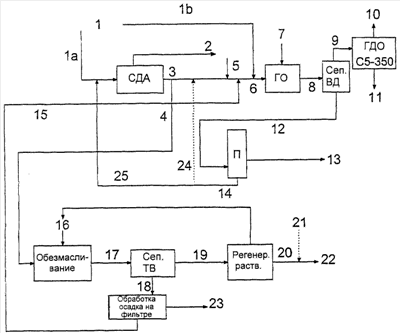 Обычно следует выполнять промывку потока асфальтенов, отводимого из секции (СДА) деасфальтизации, для того, чтобы концентрация указанных элементов в реакторе гидрообработки не становилась слишком высокой, и, в случае дезактивации катализатора, для удаления части катализатора, заменяемой на свежий катализатор. Однако в общем случае заменять часть катализатора не нужно, поскольку катализатор сохраняет свою активность в течение длительного времени; тем не менее, в силу вышеуказанных причин, промывку все же необходимо выполнять, поскольку часть катализатора, несмотря на то, что он и не был полностью дезактивирован, следует считать отработанной. Кроме того, хотя объемы промывочного потока чрезвычайно ограничены (0,5-4% от количества сырья) по сравнению с обычными технологиями гидрообработки, их использование или уничтожение все же представляет собой значительную проблему.
