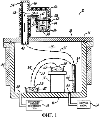 Как показано на фиг.1, устройство ХОП 10 согласно сущности изобретения содержит реакционную камеру 12, состоящую из крышки 14 и сосуда 16. Крышка 14 имеет герметичное соединение с сосудом 16, что при герметичном соединении обычно препятствует поступлению кислорода в реакционную камеру 12. Внутреннее пространство 15 определяет среду для осаждения, когда крышка 14 герметично соединена с сосудом 16, продутым атмосферными газами и вакуумированным. Крышка 14 может быть отсоединена от сосуда 16 для предоставления доступа к внутреннему пространству 15. Реакционная камера 12 изготовлена из металла, стойкого к коррозионному действию реагентов ХОП, как, например, из Inconel 601 или RA 353 MA.