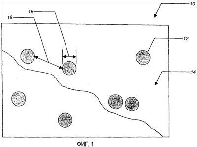 Если снова обратиться к фиг.1, то можно отметить, что содержание керамической фазы в объемных процентах предпочтительно находится в диапазоне от приблизительно 10% до приблизительно 95%, и размер или диаметр 16 наноразмерных керамических частиц 12 находится в диапазоне от приблизительно 5 нм до приблизительно 250 нм. В результате средняя величина свободного промежутка 18 между диспергированными наноразмерными керамическими частицами 12 составляет порядка приблизительно 200 нм или менее, предпочтительно порядка приблизительно 100 нм или менее. Это гарантирует твердость получающейся в результате системы 10 покрытия при высоких температурах. Соответствующая ударная вязкость обеспечивается наноразмером сравнительно твердых, хрупких наноразмерных керамических частиц 12, что ограничивает размеры зарождающихся трещин наноразмерами при сохранении пластичности, присущей основе из металлического сплава.
