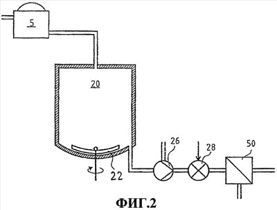 Фиг.2 показывает технологическое устройство согласно предпочтительному варианту осуществления изобретения, в котором целлюлоза выводится в промежуточный резервуар 20 из промывного аппарата 5, как в уровне техники, в выводную консистенцию промывного аппарата, при этом эта консистенция является, разумеется, более высокой, чем консистенция фильтрующей стадии 50. В этом варианте осуществления, однако, целлюлоза не разжижается в промежуточном резервуаре, по крайней мере, не до консистенции, необходимой для фильтрующей стадии, но консистенция целлюлозы поддерживается предпочтительно равной выводной консистенции из промывного аппарата. Тем не менее, в некоторых случаях, когда выводная консистенция является слишком высокой (самое большее обычно свыше 14%), целлюлоза должна разжижаться в резервуаре 20, но даже в этом случае только до средней консистенции в интервале примерно 10-12%. В варианте осуществления, показанном на этой фигуре, в соединении с дном резервуара расположен скребок 22 днища, посредством которого целлюлоза выводится из резервуара в ловушку для конденсата 24. Если разжижение необходимо, это может быть предпочтительно сделано с помощью упомянутого скребка 22 днища. Так называемый МС pump 26, имеющий возможность отделения газа из перекачиваемой целлюлозы средней консистенции, различные альтернативные варианты которого были раскрыты, например, в патентах US 4921400, US 5058615, US 5019136, US 5167678, US 4971519, US 4877424, US 4877368, US 4981413, US 5152663, US 5538597, US 5114310, US 5078573, US 5116198, US 5151010, US 5842833, US 6120252, US 6551054, Sulzer Pumps Finland, которые включены сюда посредством ссылки, расположен в нижнем конце ловушки для конденсата. Характерная особенность упомянутого насоса МС заключается в том, что ротор, производящий сильную турбулентность в целлюлозе, расположен по меньшей мере частично внутри вводного тракта насоса. В большинстве случаев ротор объединен с крыльчаткой упомянутого насоса. Насос МС используется и для выпуска целлюлозы из ловушки для конденсата и для отделения газа. Целлюлоза подается в смеситель 28 посредством насоса 26, при этом смеситель используется для разжижения целлюлозы в консистенцию следующей стадии процесса, в данном примере фильтрующей стадии 50.
