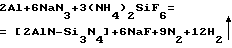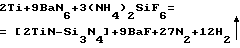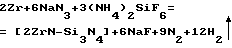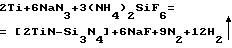(57) Реферат: Изобретение относится к порошковой металлургии, в частности к производству тугоплавких материалов и может быть использовано в аэрокосмической, химико-металлургической, инструментальной и других отраслях промышленности. Способ включает приготовление экзотермической смеси, содержащей по крайней мере один порошок азотируемого элемента и комплексную фторидную соль аммония, воспламенение смеси в среде азота под давлением, при этом экзотермическая смесь содержит по крайней мере другой азотируемый элемент, входящий в состав комплексной фторидной соли аммония или в состав фторида элемента, и азид щелочного или щелочноземельного металла. Способ обеспечивает степень чистоты целевых компонентов 90% и повышение безопасности проведения процесса. 2 табл. Изобретение относится к производству тугоплавких материалов и может быть использовано в аэрокосмической, химико-металлургической, инструментальной и других отраслях промышленности для синтеза порошковых композиций на основе нитридов элементов, применяемых для изготовления изделий, обладающих высокой термостойкостью, твердостью, износостойкостью, эрозионной стойкостью, стойкостью в агрессивных средах, стабильностью физических свойств в широких температурных диапазонах и используемых в различных областях техники. Известен способ получения нитрида элемента, включающий приготовление смеси, состоящей из порошка азотируемого элемента и азида щелочного или щелочноземельного металла (аналог – [1]). Недостатком способа является то, что продукты синтеза помимо нитридов титана и циркония содержат остаточный натрий в виде Na, Na2O, NaOH, Na2TiO3 (Na2ZrO3). Это сказывается в свою очередь на степени чистоты целевых нитридов. Кроме того, процесс синтеза нитридов в системе “элемент – азид” является небезопасным, так как почти в 50% случаев при вскрытии реактора происходит возгорание натрия свободного, и целевой продукт синтеза содержит после этого менее 15-20% нитрида. Наиболее близким к описываемому изобретению по технической сущности является способ получения порошковых композиций на основе нитридов элементов, который заключается в приготовлении экзотермической смеси, состоящей из порошка азотируемого элемента (Si), азида щелочного металла и комплексной фторидной соли аммония, и воспламенении ее в среде азота под давлением (прототип – [2]). Недостатками способа-прототипа являются: – невозможность в принципе получения порошка после синтеза в данном устройстве; – степень чистоты, например, нитрида кремния, не превышает 80%, а содержание кремния свободного в нитриде доходит до 10-15 мас.%. Сущность изобретения заключается в том, что способ получения порошковых композиций на основе нитридов элементов включает приготовление экзотермической смеси, состоящей из азотируемого элемента, азида щелочного или щелочноземельного металла и комплексной фторидной соли аммония и элемента или фторида элемента; воспламенение смеси в среде азота под давлением. При этом в качестве горючего используется один азотируемый элемент, а в состав комплексной фторидной соли аммония и элемента или фторида элемента входит азотируемый элемент другой химической природы. Отличительным признаком предлагаемого способа является то, что экзотермическая смесь содержит по крайней мере один азотируемый элемен