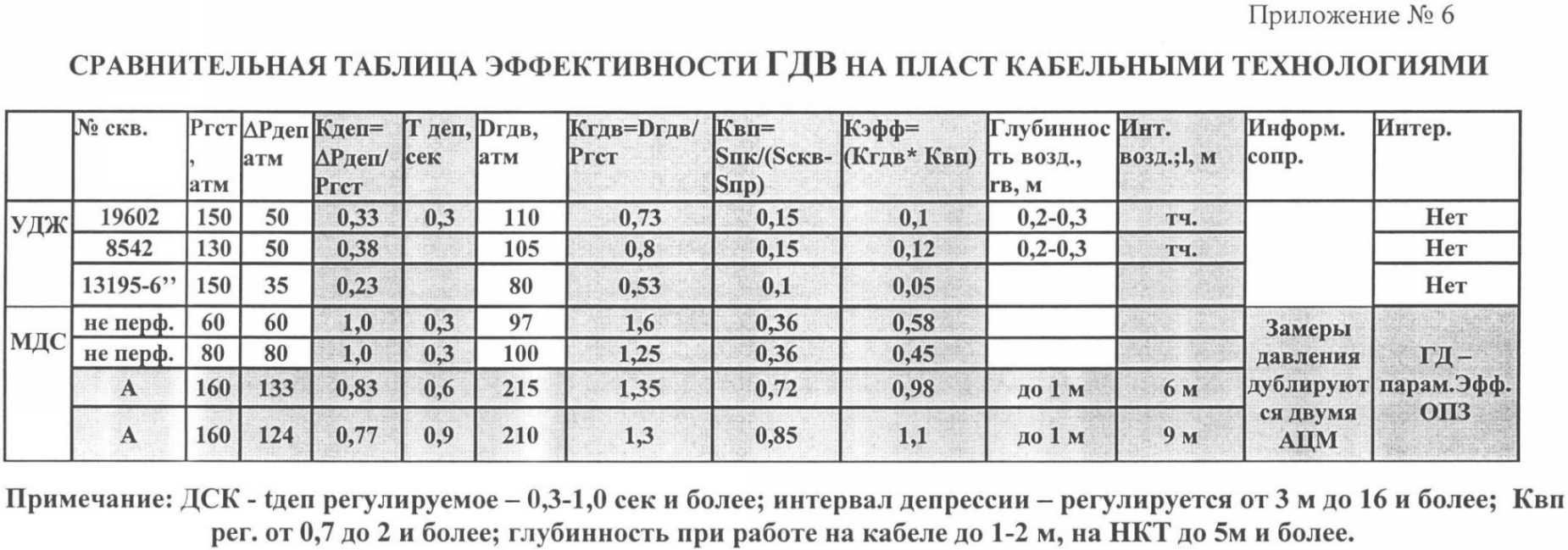 В приложении 6 приведена сравнительная таблица эффективности гидродинамического воздействия на пласт кабельными технологиями. Для более объективной оценки эффективности методов нами введены новые критерии, такие как: