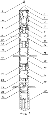 Устройство по первому варианту изображено на фиг.1. Оно состоит из кабельного наконечника 2, приборной головки 3, пускового механизма, расположенного в корпусе 5, верхнего приемного фильтра 11 с клапаном 10 и депрессионной камерой 14, второго приемного фильтра 15 с клапаном 16 и депрессионной камерой 18, третьего приемного фильтра 20 с клапаном 21 и депрессионной камерой 22 и нижнего приемного фильтра 24 с клапаном 25 и депрессионной камерой 26, к которой подсоединен манометрический блок 27. Пусковой механизм включает в себя электромагнит 4, пусковой клапан 6 с опорным диском 8 и соединяется с верхним приемным фильтром переходником 7. Депрессионные камеры 14, 18, 22 выполняются из насосно-компрессорных труб 13, 17, 19 и 23. Конструктивно пусковой клапан 6 и клапаны приемных фильтров 10, 16, 21 и 25 выполнены в пневмогидроуравновешенном исполнении атмосферного и гидростатического давлений. Герметизация отдельных узлов устройства осуществляется с помощью уплотнительных резиновых колец 12.