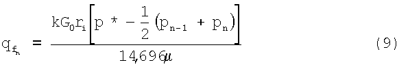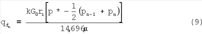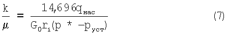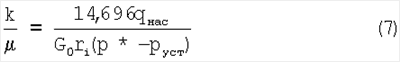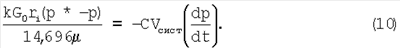 В уравнении (15) m=(р*-руст)/qнас. Единицами измерения для k/µ является мД/сП, для абсолютного давления рn и p* – фунт на кв. дюйм, для ri – рм, для qпр.п – см3/с, для Vнас и V0 – см3, для С – (фунт на кв. дюйм)-1, а для t – секунды. Каждое значение давления на прямолинейном отрезке представляет собой установившееся давление при данной скорости притока (или скорости всасывания).