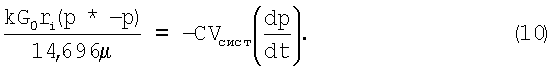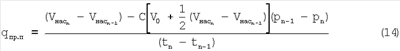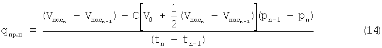 Условия установившегося притока упростят уравнение (14), так как (рn-1-рn)=0. В условиях установившегося притока для определения точек прямолинейного отрезка графика на фиг.23 можно использовать известные параметры прибора и измеренные значения. На этом отрезке в уравнение можно подставить скорость откачки qнас. Тогда, используя qнас в уравнении (9), получим: