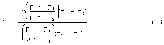 Этими наблюдениями можно воспользоваться для создания быстрого способа нахождения точного значения р*. Сначала вычислим среднее значение тангенса угла наклона кривой на произвольном раннем интервале данных, представленных в таблице 2. Расчет тангенса угла наклона начинается при t1 и р1 и заканчивается при t2 и p2. Затем вычислим средний тангенс угла наклона позднего участка кривой по более позднему интервалу данных указанной таблицы. Подстрочными индексами для параметров начала и конца этого расчета будут соответственно 3 и 4. Теперь разделим тангенс угла наклона раннего участка кривой на тангенс угла наклона позднего участка кривой, получив коэффициент R: